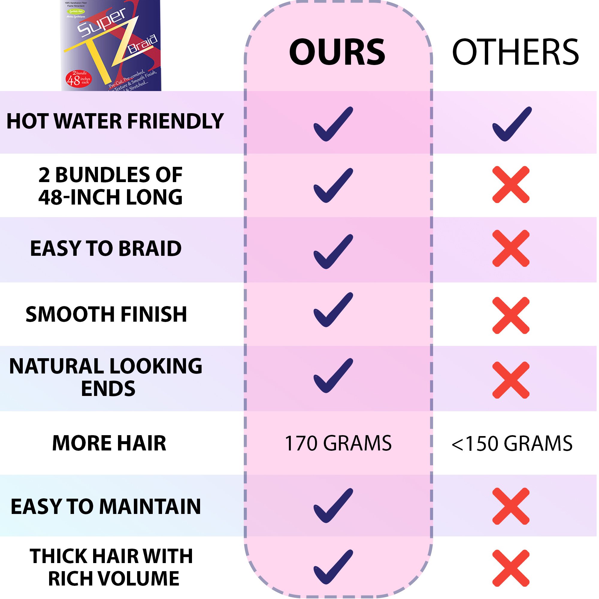 Our professional braid hair extensions are ready to make you look stunning! The extensions come ready to use, in 2 bundles of 48-inch long unfolded, pre-stretched and pre-combed, so you can style your braids in amazing ways, making your hair look fuller, thick and natural! Made with 100% Kanekalon fiber, these hair extensions have a smooth finish, being super light, soft and with a natural glow, that will make you look gorgeous. Our extensions are safe to dip in hot water, which softens and smooths the synthetic hair, making it more manageable to style your hair straight, curly, crochet, or other styles.